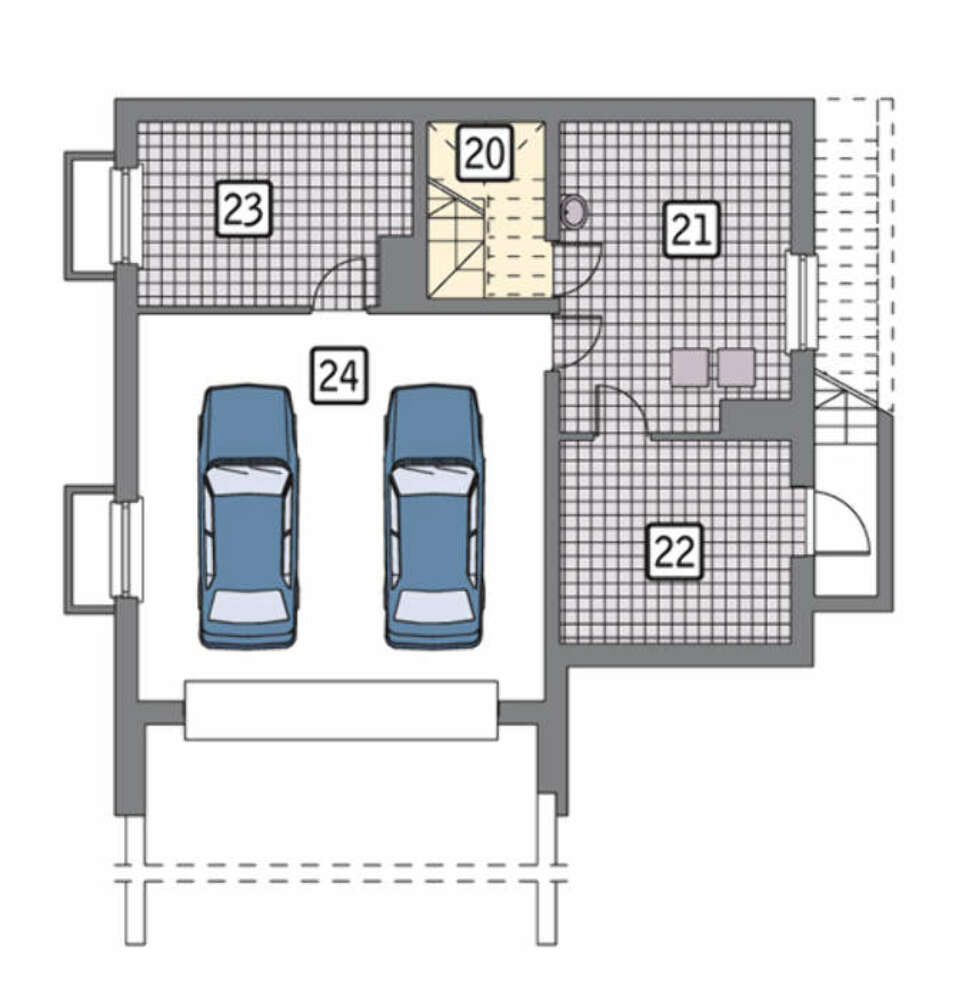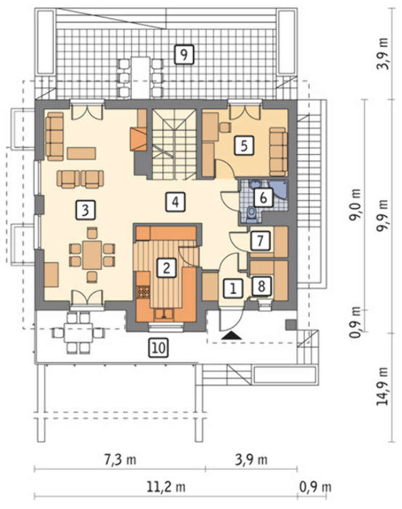 Для экономии места, встроенный гараж оборудован в цокольном этаже. Оставшееся пространство можно использовать для хранения съестных припасов, строительства сауны или кладовой. Первый этаж условно разделен на две части, одну из которых занимает гостиная со столовой. Из комнаты предусмотрено сразу два выхода на разные веранды, это удобно и практично. Кухня расположена в центре, одинаково доступная как из жилой части, так и из зоны отдыха.