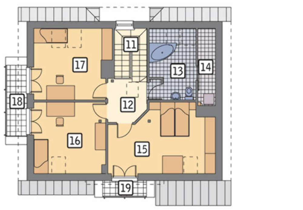 Вторую часть первого этажа занимает спальня и подсобные помещения в виде гардероба, санузла и отдельной личной комнаты. Несмотря на небольшие размеры, она комфортная и имеет собственный выход на веранду, что дает возможность хозяину вести независимый образ жизни. Остальные спальни, а их три, расположены на втором этаже. Они просторные и уютные, все имеют выходы на балкон. Значительных размеров комната запланирована в качестве санузла и рассчитана на размещение самого современного сантехнического оборудования.