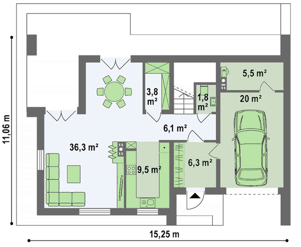 В пространстве первого этажа не приветствуется объединение помещений. Для каждого действия найдено свое место. Гостиная зона сформирована вокруг камина. За счет собственного выхода на загородный простор дает друзьям и родственникам возможность много времени проводить на свежем воздухе и получать радость от общения с естественной природой. Зона приема пищи выполнена и сформирована самостоятельным помещением. Происходящие здесь процессы и царящие запахи остаются тайной как для проживающих, так и для их многочисленных друзей. Светские приемы и хлебосольные пиры устраиваются в специально выделенной зоне. Ее особенность в отдельном выходе на террасу, где предусмотрительно приготовленные на открытом огне куски мяса и свежие овощи смогут внести разнообразие в загородное меню. Небольшой гараж прекрасно справляется с размещение одного авто, для того чтобы его обслуживать имеется небольшое примыкающее помещение.