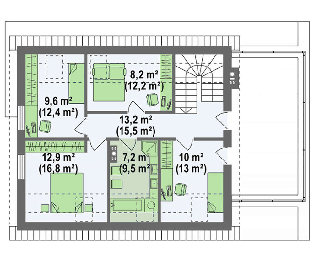 Четыре личных спальни устроенные на втором уровне смогут разместить многочисленных жильцов строения. Их пространство рассчитано на отдых и проведение личного времени. Как достоинство, стоит отметить различные варианты планировки комнат. Размещенная над гаражом терраса дает возможность на свежем воздухе читать книги, в летнее время выращивать цветы и устраивать чаепития.