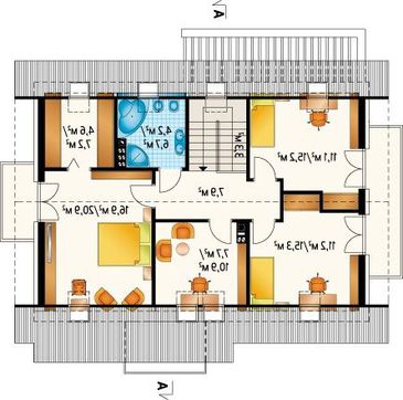 Для отдыха и индивидуальных дел выделено место на втором этаже. Предусмотрены четыре помещения, одно из которых имеет наибольшую площадь и состоит из двух комнат. Уютные маленькие балкончики вносят разнообразие в отдых и особенно понравятся мечтателям и романтикам.