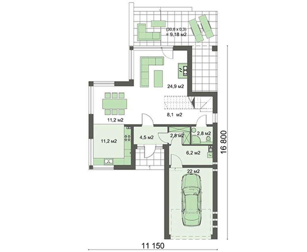 В проекте предусмотрен встроенный гараж, его площадь помогает разместить одно авто. В смежном помещении находится топочная, которую хозяева, как правило, превращают в домашнюю мастерскую. В приватных усадьбах без нее практически не обойтись.