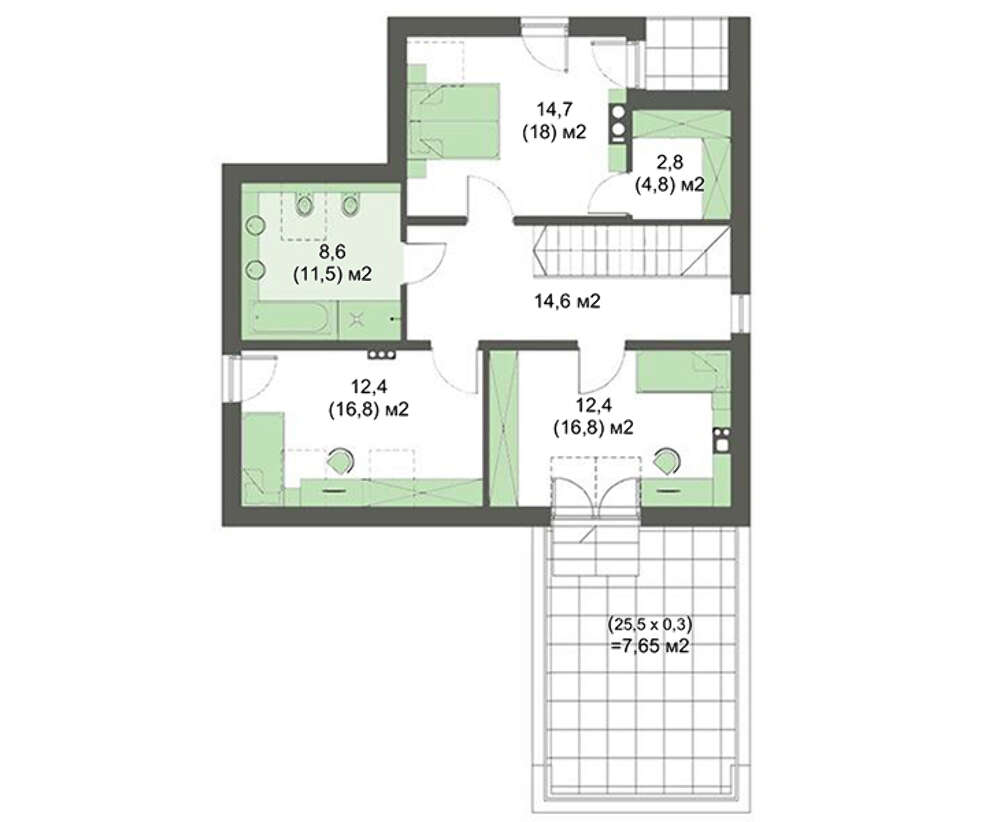 Второй уровень отдан под личную территорию. Здесь расположены три спальни разной площади и комфортности и санитарная комната.