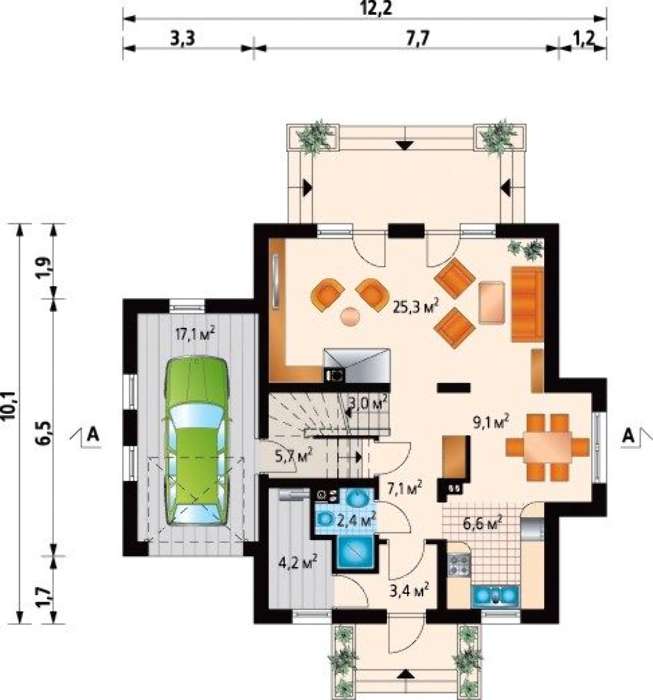 При планировании внутреннего пространства выполнено четкое разделение на зону общего времяпрепровождения — это первый этаж и верхние уровни для индивидуальных апартаментов. Удобно расположенный на первом этаже гараж надежно защищает автомобиль от катаклизмов атмосферы. Друзья и знакомые могут по своему усмотрению распоряжаться всем остальным пространством. Большая его часть отдана под гостиную с отдельным выходом на живописную территорию, где в окружении кустов роз и виноградных арок можно прогуливаться, за обе щеки уплетать яблоки и груши и наслаждаться соловьиными трелями. Удобно, что кухонная зона максимально отдалена и не докучает своими резкими запахами жареной и вареной пищи.