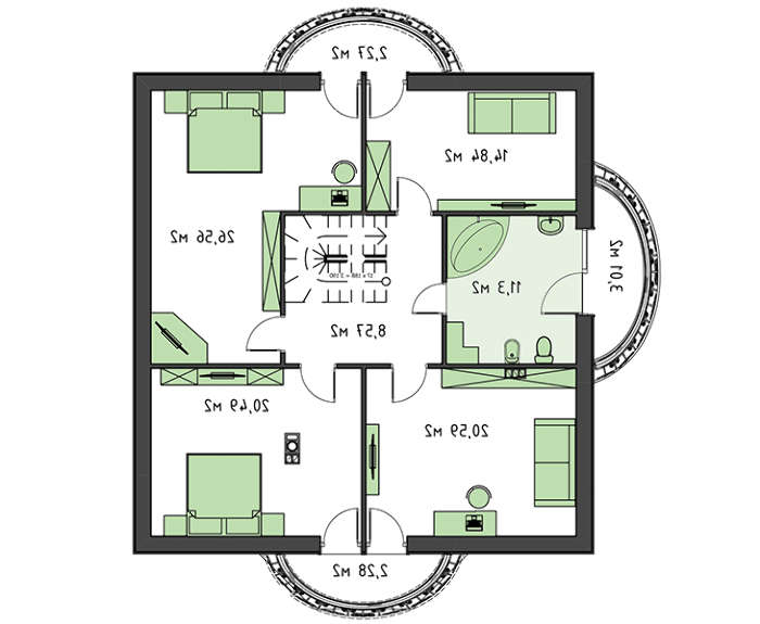 Проект содержит три раздела – Архитектурный, Конструктивный и Инженерный: водоснабжение, отопление, вентиляция, канализация, электроснабжение (приобретается за дополнительную плату) + Пояснительная записка.