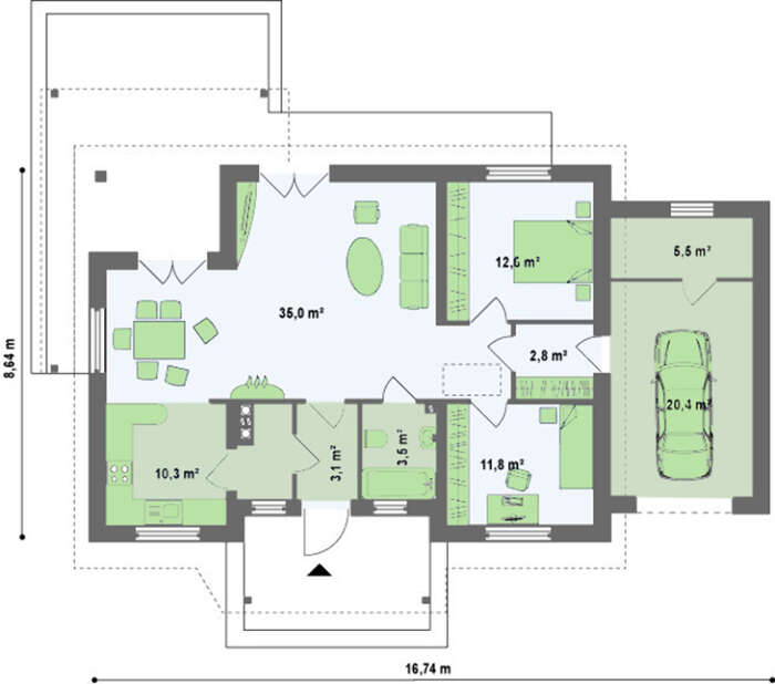Проект содержит три раздела – АрхитектурныйКонструктивный и Инженерный: водоснабжение, отопление, вентиляция, канализация, электроснабжение (приобретается за дополнительную плату) + Пояснительная записка.