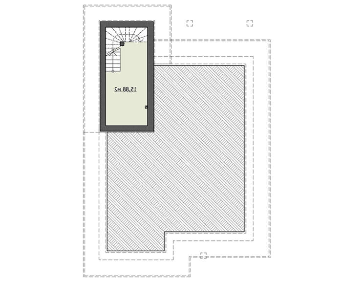 На первом этаже выделено место под личное помещение, куда удобно поселить старших членов семьи. Планировкой предусмотрены дополнительные комнаты, их можно использовать как кладовые для хранения техники и гардеробы. Угловая лестница поможет хозяину дома попасть на цокольный этаж, его планировку предлагается подобрать по собственному желанию.