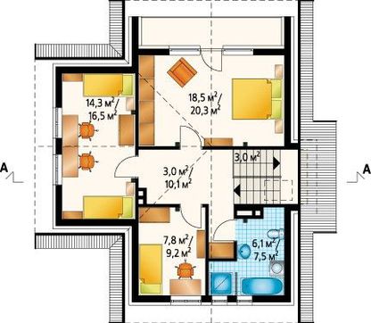 Три спальни второго этажа с комфортом разместят членов дружной семьи. При разделении пространства проектировщики постарались максимально отодвинуть комнаты друг от друга, чтобы поддерживать приватность частной жизни. Одна из горниц отличается большей площадью и в свои размеры включает просторный балкон. Его наличие позволит владельцу не только наблюдать за красочными закатами или рассветами, но и раскинувшись на компактном креслице за небольшим столиком пить по утрам ароматный кофе или посматривая томно вдаль, читать томик Ахматовой.