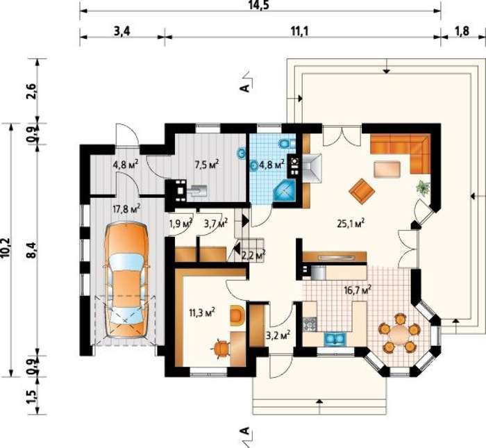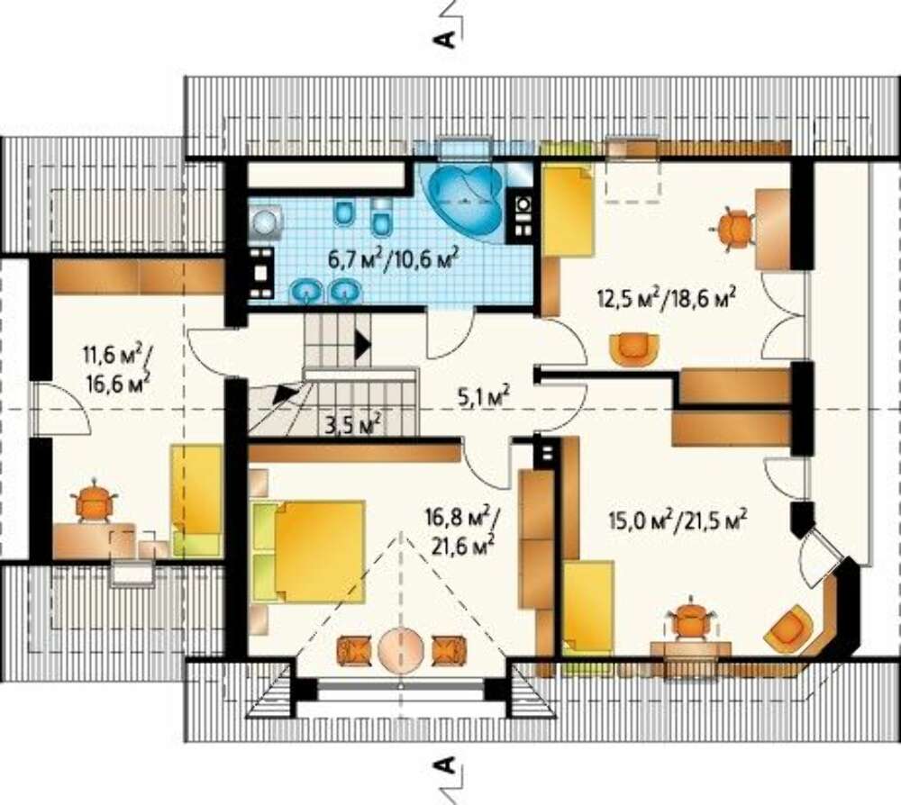 Достаточно взглянуть на интересное строение площадью свыше 150 квадратов с угловым эркером, чтобы получить заряд бодрости и поднять настроение. В его оформлении задействованы приятные жизнерадостные тона. Желто-оранжевые оттенки добавляют лучистости и напоминают о солнечных летних деньках. Двускатная большая крыша выделяет постройку среди серых будней действительности и делает здание выразительным и запоминающимся. Природные тона поверхностей коттеджа прекрасно вписываются в живописную загородную растительность.