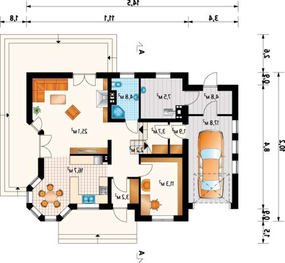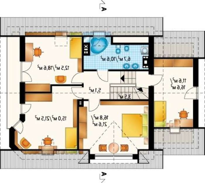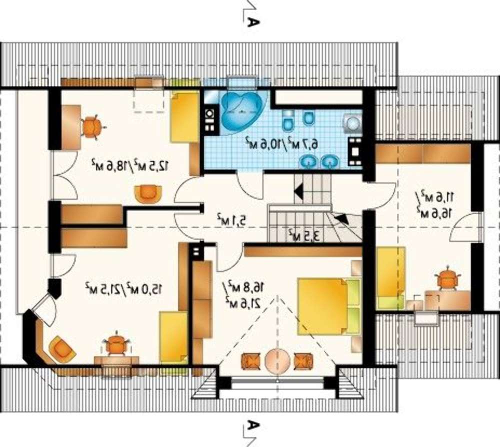 Достаточно взглянуть на интересное строение площадью свыше 150 квадратов с угловым эркером, чтобы получить заряд бодрости и поднять настроение. В его оформлении задействованы приятные жизнерадостные тона. Желто-оранжевые оттенки добавляют лучистости и напоминают о солнечных летних деньках. Двускатная большая крыша выделяет постройку среди серых будней действительности и делает здание выразительным и запоминающимся. Природные тона поверхностей коттеджа прекрасно вписываются в живописную загородную растительность.