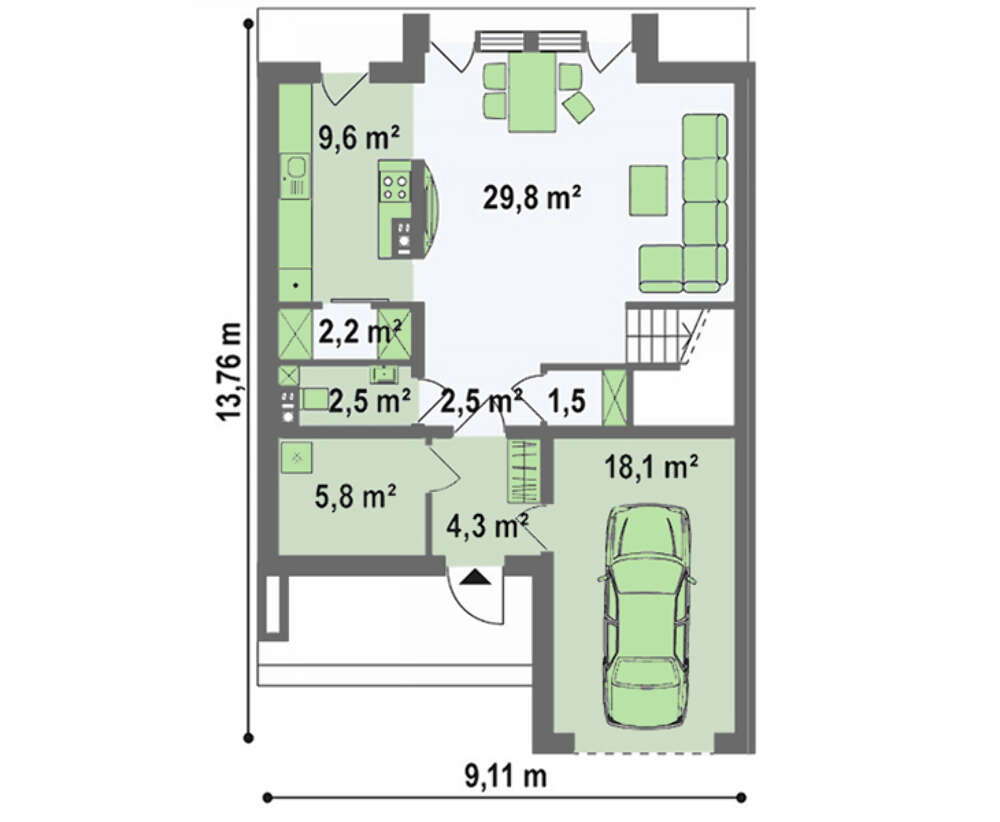 Разделяют квартиры встроенные гаражи, каждый на одну единицу транспорта. Такая планировка способствует звукоизоляции жилого пространства семьи.