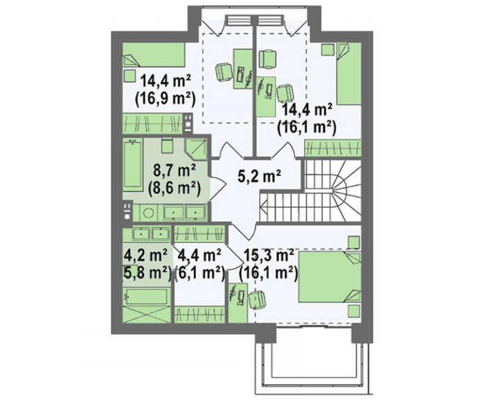 Второй этаж рассчитан на три личные комнаты. Апартаменты хозяина достойны особого внимания. Кроме большей площади, они выделены индивидуальными удобствами: санузел, гардероб и балкон.