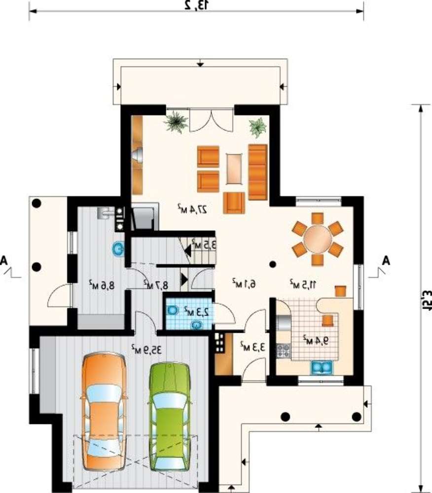 Особенность строения в огромном гараже, рассчитанном на две машины и выполненном рядом с большой автомастерской, помогающей решать настоящие мужские проблемы. Дружелюбный характер дома проявляется в планировке первого этажа, который объединяет вместе всю площадь уровня и поделен на зоны чисто условно. Большая кухня легко помещает всю необходимую для приготовления вкусных обедов и ужинов мебель и бытовую технику. Угловая, освещенная с двух сторон, часть комнаты используется как столовое место, для этого оформлена большим столом и требуемым количеством стульев. Гостиная часть имеет отдельный выход на террасу, это позволяет в зону приема друзей и родственников включить часть загородной территории. Всего-то и потребуется: разместить несколько лавочек и разрисовать живописными красками цветник.