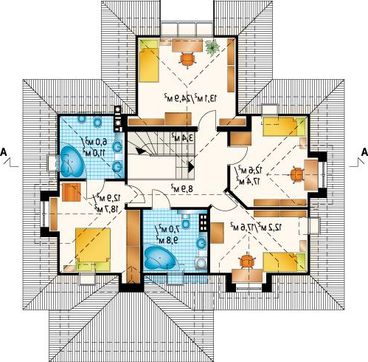 Второй этаж превращен в спальную зону, которая разделена на четыре жилых помещения. Каждое имеет свои особенности, отличаются по площади, и планировке. Одно выделено в полноценные комфортные апартаменты за счет личного большого санпомещения.