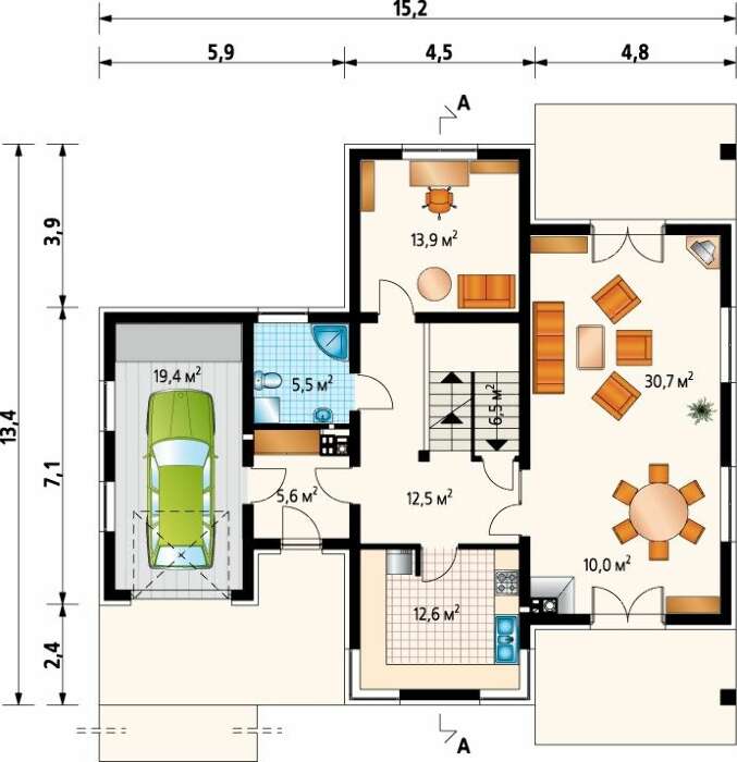 Проект содержит три раздела – АрхитектурныйКонструктивный и Инженерный: водоснабжение, отопление, вентиляция, канализация, электроснабжение (приобретается за дополнительную плату) + Пояснительная записка.
