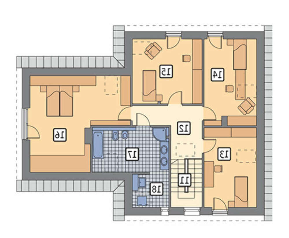 Четыре основные спальни расположены на втором этаже. Три из них имеют уютные французские балкончики. Большую площадь занимает санитарное помещение, его размеров достаточно для установки современного сантехнического оборудования. Интересно решена планировка апартаментов хозяина. Они просторные и уютные за счет сложной формы.