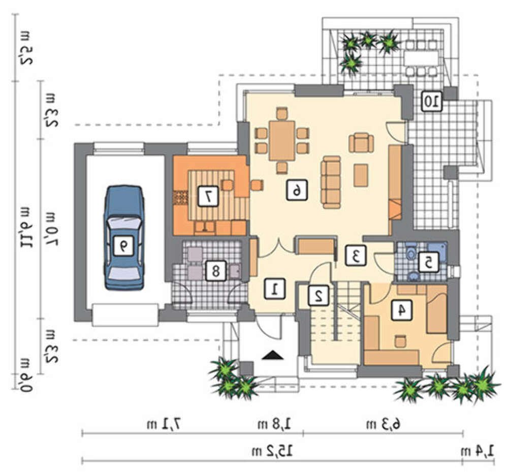 В проекте первого этажа предусмотрен удобный гараж, к его территории примыкает небольшая комната для хранения инструмента и выполнения мелких слесарных работ по хозяйству. Для кухни выбрано непривычное место – центр дома. В данном случае это удобно и позволяет дислоцировать запахи в небольшом пространстве. Под место отдыха выделена большая площадь, примыкающая к кухне. Выход на террасу делает отдых более разнообразным.