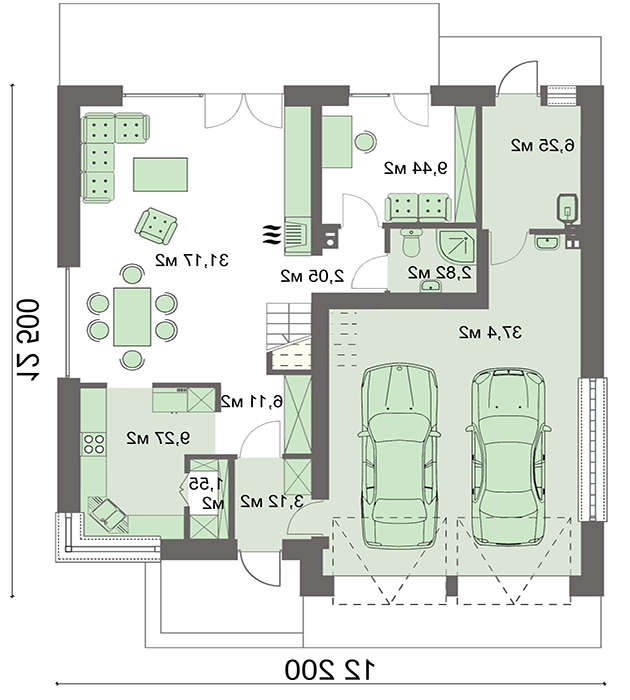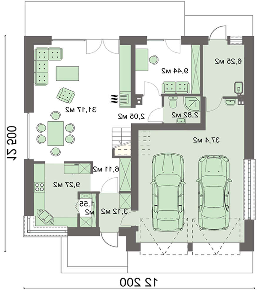 Простор гостиной зоны получен объединением всех мест для общего проведения времени. Выход на веранду дает возможность встречать гостей, минуя хозяйственные помещения. Кухня отнесена в угловую часть и полуобособлена. Оставляя все пищевые запахи в небольшом специально отведенном объеме, планировка позволяет хозяйке быть в курсе всех происходящих в комнате событий. Включение гаражного пространства в габариты жилого дома высоко ценят хозяева-автолюбители. Появляется возможность хранение двух автомобилей и их техническое обслуживание выполнять в комфортных условиях.