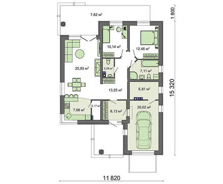 Под кухню отведено немного места, но отсутствие перегородок наполняет помещение светом и не ограничивает пространство. Под гараж отведена площадь, достаточная для содержания одного автомобиля. Примыкающая топочная поможет разместить требуемые для обслуживания машины инструмент и приспособления.