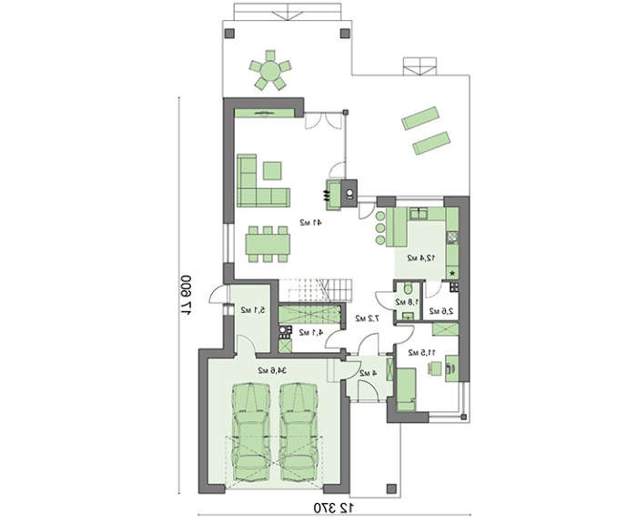 Особняк рассчитан на проживание большой и дружной семьи. Просторный гараж разместит на хранение два автомобиля, предусмотрена площадь для выполнения сервисных работ. Гостиная комната соединила в одно помещение места разного назначения: приготовления, приема пищи и отдыха. Необычная Г-образная форма позволила вынести кухню в отдаленную часть. Благодаря такой планировке пищевые запахи не смогут гулять по жилой зоне. Отдельная комната выделена для хранения съестных запасов.