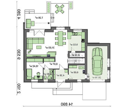 Внутренняя часть первого этажа включает три блока. Гаражная площадь имеет достаточные размеры для хранения одной единицы транспорта. Гостиная выполнена в виде кухни-студии. Для удобства перемещения предусмотрен выход прямо на загородный участок. В центре дома установлен камин. Его конструкция позволяет использовать устройство не только как дополнительный источник отопления. Языки пламени расслабляют и успокаивают, создают у человека чувство защищенности.