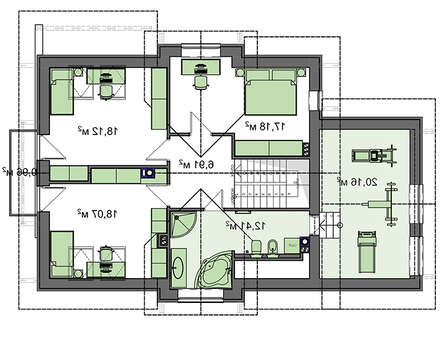 Обособленная комната первого этажа — идеальное место для спальни старшего поколения. Уединенное расположение защищает помещение от посторонних звуков. Близость санузла и гардероба создает дополнительный комфорт. Остальные три спальни находятся на втором уровне. Личные апартаменты соединены общим холлом. В планировке двух комнат предусмотрены выходы на балкон. Просторный чердак может быть использован под подсобные помещения.