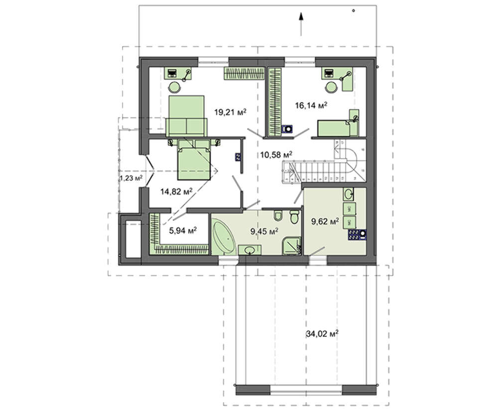 Небольшая семья с удобствами разместится в трех спальных помещениях второго этажа. Комнаты комфортные и спокойные. Хозяйские хоромы выгодно выделяются. Здесь есть личный гардероб и просторный балкон. Санузлов запроектировано два, для удобства они разнесены на разные этажи.