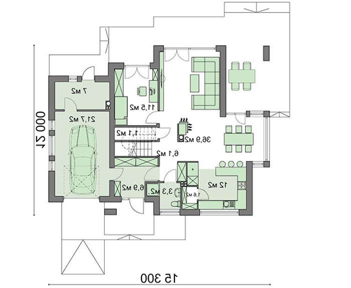Внутренняя планировка понравится любителям комфорта и всевозможным помещений разного назначения. Гаражная площадь в 20 квадратов позволяет разместить один автомобиль. Гостиная имеет сложную форму, несмотря на отсутствие перегородок между кухней, столовой и местом отдыха, зоны различного назначения позволяют жильцам независимо заниматься разнообразными делами и находясь в одном помещении не мешать друг другу. За счет вынесения столовой в район эркера время обедов проходит в обстановке потрясающей красоты, в окружении картин природы.