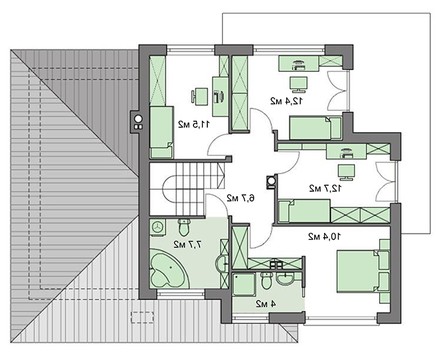 Достоинством коттеджа станут спальные помещения. Их предусмотрено пять. Комната первого уровня идеальна как жилье для старших членов семьи. Второй этаж представлен апартаментами разной площади, планировки и размеров. Каждый из обитателей дома имеет возможность выбора. Огромным бонусом станет просторная, ориентированная на две стороны, терраса.