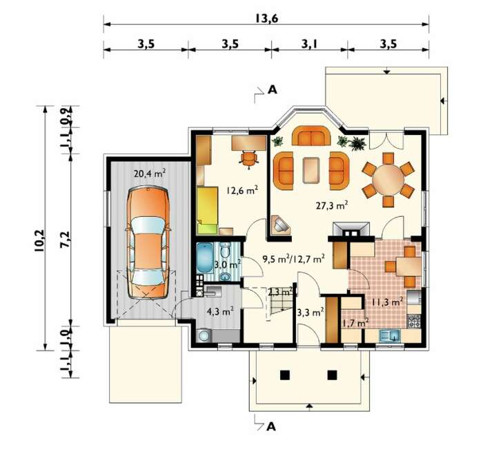 Красивый загородный дом с эркером и выходом из гостиной прямо в сад производит на входящих на территорию участка приятное впечатление. Для его оформления использованы благородные оттенки, которые при наличии яркой темной крыши становятся выразительными и делают здание броским. Особенность строения в красивом и большом эркере, принадлежащем гостиному помещению. Панорамные окна наполняют внутренний простор солнечным светом и вносят в дом торжество. Трудно найти более удачное место для размещения обеденного стола. Врывающиеся сквозь стекло природные картины будут лучшим фоном для завтраков и ужинов, сделают каждую дружескую встречу исключительной и превратят в праздник. Отличным окружением для столь благородного строения будут яркие клумбы, альпийские горки и цветущие кусты. Они смогут добавить радость и внести роскошь на загородный участок.