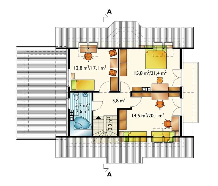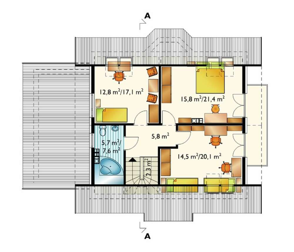 Полноценный отдых гарантируют четыре отдельных помещения. Комната на первом этаже наиболее привлекательна для старшего поколения, не получающего удовольствия от лестничных вершин. Две спальни второго этажа имеют преимущества от наличия балкона. Его просторы рассчитаны на небольшое кресло или стол, уютный шезлонг. Разместив мебель можно не только увеличить площадь, но и доставить себе удовольствие от наблюдений за красотой природы.