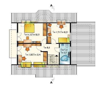 Полноценный отдых гарантируют четыре отдельных помещения. Комната на первом этаже наиболее привлекательна для старшего поколения, не получающего удовольствия от лестничных вершин. Две спальни второго этажа имеют преимущества от наличия балкона. Его просторы рассчитаны на небольшое кресло или стол, уютный шезлонг. Разместив мебель можно не только увеличить площадь, но и доставить себе удовольствие от наблюдений за красотой природы.