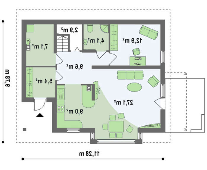 Главная особенность этого проекта уютного дома с дневной зоной в том, что она расположена со стороны входа. Такая планировка и угловое расположение самого входа позволяют организовать въезд во двор, как с южной, так и с восточной стороны. Благодаря этому окна в гостиной выходят на светлую сторону. Огромная комната, залитая солнечным светом, создает ощущение полного умиротворения и гармонии в доме. Настоящий дом солнца...
