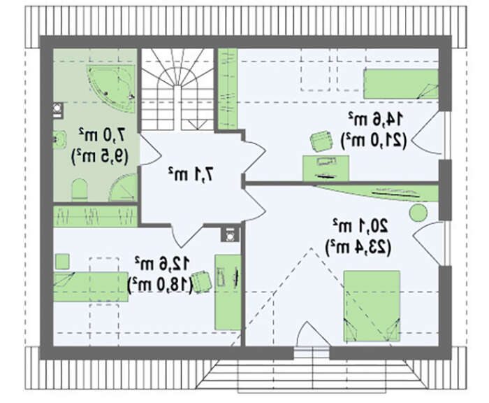Три спальни и ванная комната вынесены на второй этаж. Лучи солнца, проникающие через мансардные окна и балкон, создают атмосферу покоя. Поэтому проект дома с дневной зоной - отличный выбор!
