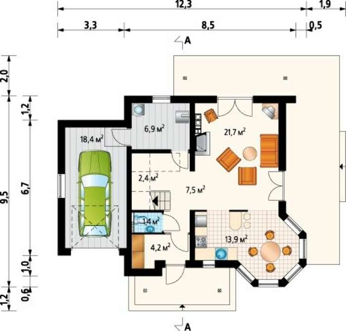 Мансардный дом с круглым эркером в кухонной зоне 4M3361