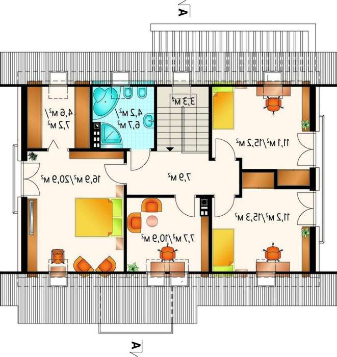 При проектировании уютного мансардного дома с верандами основное внимание уделено дереву, как основному строительному материалу. Его светлая расцветка приятная для глаз. В масштабах постройки материал использован для изготовления дверных и оконных рам, декорирования стен. Такое почитание естественной красоты наполняет здание дружелюбием и оставляет от любования приятное впечатление.