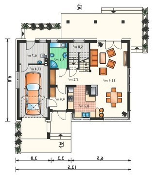 Все пространство для коллективного времяпрепровождения собрано в одно помещение. Кухне отдана наиболее отдаленная часть, рядом со столовой. Со стороны гостиной предусмотрен выход прямо на загородный простор, в пространство веранды, защищенной навесом от солнца. Габариты террасы достаточные для расположения шезлонгов, столов со стульями, которые смогут разнообразить отдых и сделать его более насыщенным.