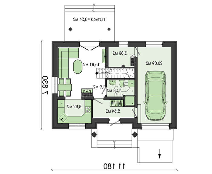 Размещенный под одной крышею с домом благоустроенный гараж создает дополнительные удобства для хозяина жилья. В общей гостиной зоне объединены все требуемые для приема гостей пространства. Кухонная площадь размещена в торце комнаты. Остальная часть помещения используется для размещения диванчиков и кресел, которые помогают максимально расслабиться и отдохнуть в кругу друзей. Такую светскую атмосферу поддерживает большая терраса, в которую легко переходит гостевое пространство.