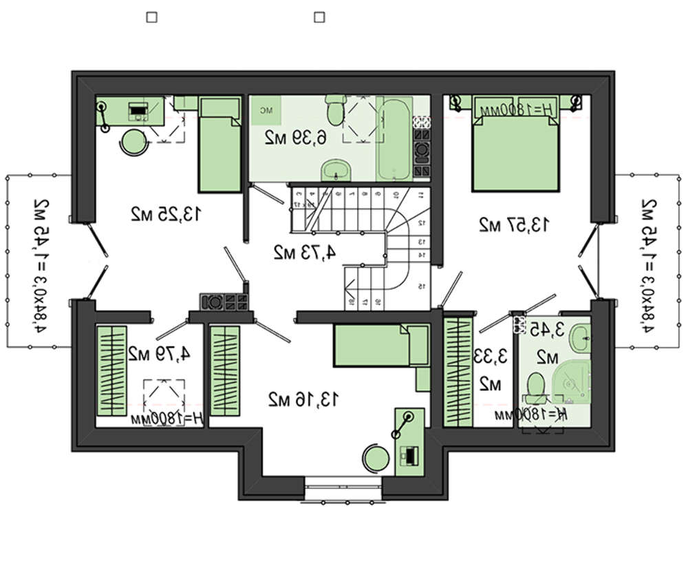 Второй этаж рассчитан на создание атмосферы отдыха. Три отдельные комнаты с особо выделенным местом под гардероб спроектированы с учетом создания хороших условий для расслабления. Два помещения имеют выходы на отдельные, разнесенные на разные стороны света балконы. Уединенное расположение каждой спальни позволяет жильцам проводить свободное время не мешая друг другу.