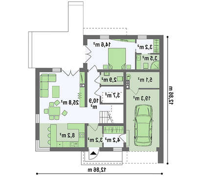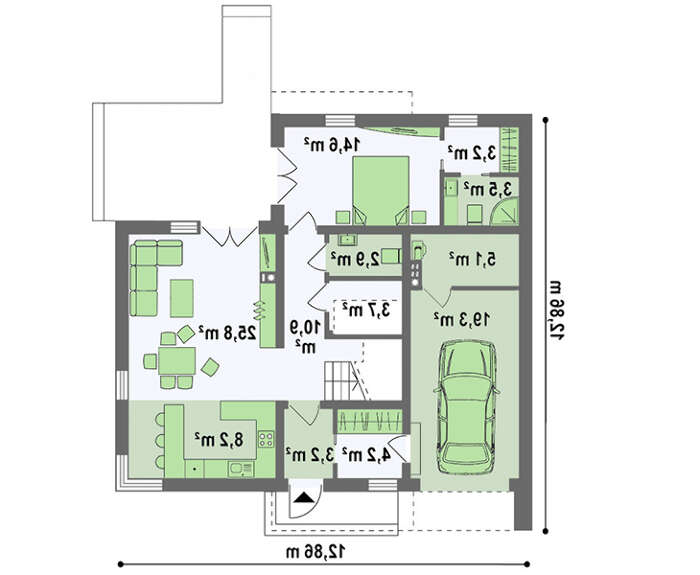 Внутреннее пространство разделено необычно и рационально. За счет этого удалось получить достаточное количество подсобных помещений, которые обладатели домовладения могут использовать на свое усмотрение. Удобство создает расположенный в габаритах строения гараж для одного авто и мастерская на его обслуживание. Гостиное пространство представлено соединенными вместе просторами для приема друзей и родственников, которые включают кухню со столовой. Каждая из зон условно отделена за счет размещения, но близкое расположение позволяет быстро готовить вкусные яства на большие общества, застилать столы-самобранки и одновременно проводить время в теплой дружеской компании.
