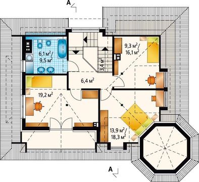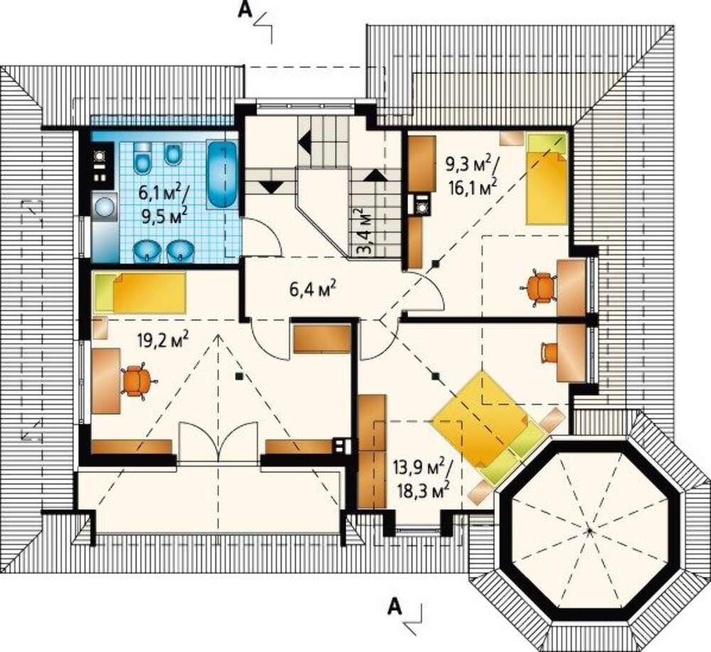 Второй этаж представлен тремя личными комнатами, рассчитанными на комфортное размещение жильцов и гостей. Все помещения необычны по форме и отливаются площадью. Разнообразие поможет любому найти каждому комнату по вкусу.