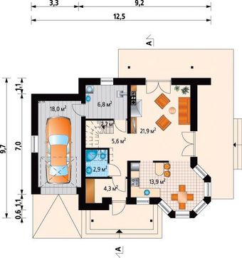 Небольшие размеры коттеджа никак не повлияли на комфорт и благоустроенность. На первом этаже достаточно места для просторного гаража и гардеробного помещения. Большие размеры гостиной зоны рассчитаны на прием немалого количества родственников и друзей. Интересно выполнено планирование столовой и кухонной зоны. Место приема пищи перенесено в район эркера, через большие окна которого помещение наполняется светом и привлекательными картинками природы. Столовая органично переходит в кухонное пространство, которое благодаря необычной планировке позволяет разместить все необходимое для приготовления пищи.