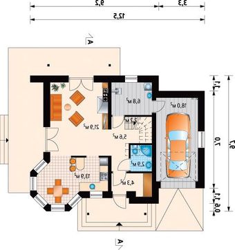 Небольшие размеры коттеджа никак не повлияли на комфорт и благоустроенность. На первом этаже достаточно места для просторного гаража и гардеробного помещения. Большие размеры гостиной зоны рассчитаны на прием немалого количества родственников и друзей. Интересно выполнено планирование столовой и кухонной зоны. Место приема пищи перенесено в район эркера, через большие окна которого помещение наполняется светом и привлекательными картинками природы. Столовая органично переходит в кухонное пространство, которое благодаря необычной планировке позволяет разместить все необходимое для приготовления пищи.
