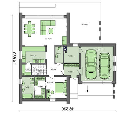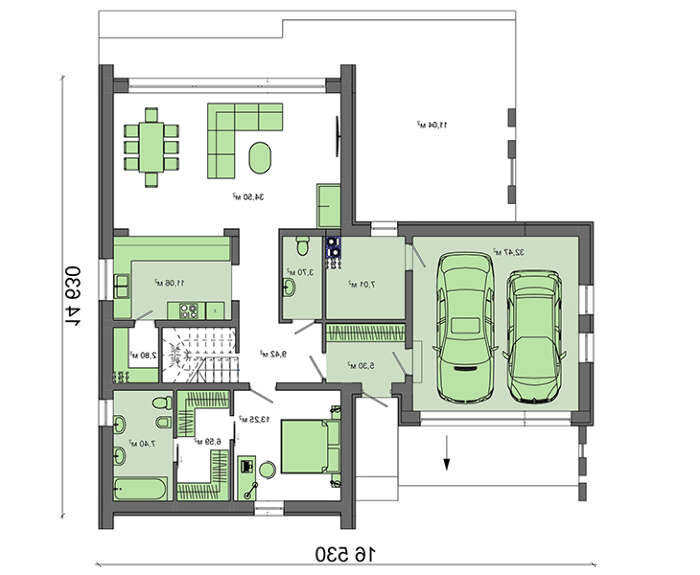 Панорамные окна впускают потоки солнечного света, шикарные пригородные пейзажи, максимально приближают природу к человеку. Помимо презентабельной гостиной, в масштабах первого этажа найдено место для просторного гаража на два авто. Ёмкая мастерская рассчитана на весь инструмент, требуемый для обслуживания машины и выполнения небольших сервисных работ по дому.