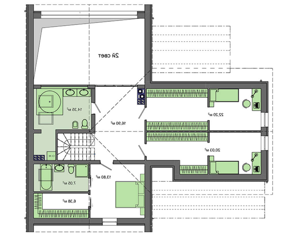 Помещение для приготовления пищи выделено в отдельную комнату, имеется площадь для хранения припасов и кухонного оборудования. Гостиное пространство сконцентрировано вокруг каминной зоны. Собственный выход на загородный участок разнообразит отдых позволит видоизменить досуг как домочадцев, так и их приятелей. На террасу можно перенести вечеринку, место послужит площадкой для приготовления пахучих и вкусных шашлыков, принятия солнечных ванн. Личные комнаты особенно благоустроены. Четверо комфортабельных апартаментов включают в габариты гардеробные помещения, рассчитанные на хранение обширных запасов одежды. Две комнаты за счет собственного санитарного узла делают приватную жизнь хозяина самостоятельной и независимой.