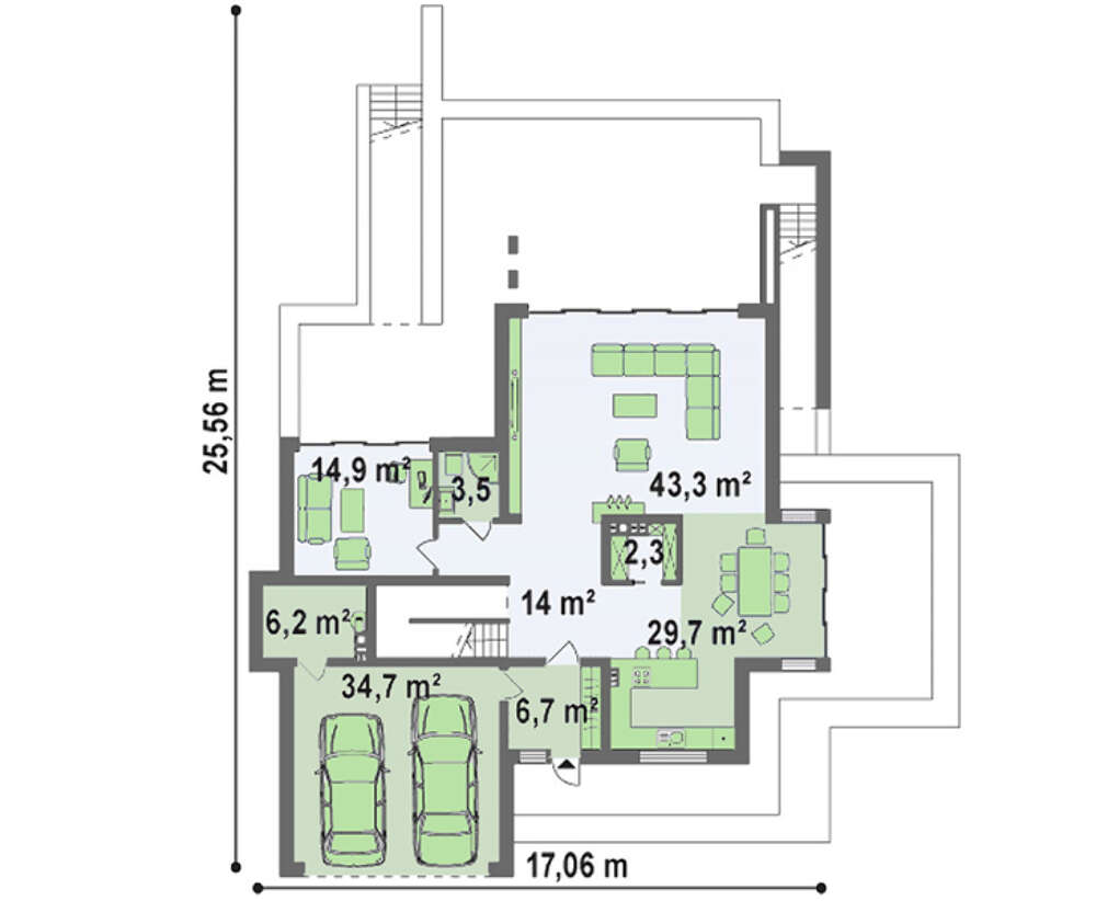 Широкий гараж получит высокую оценку от автолюбителей. Его достоинство в просторе, рассчитанном на два автомобиля и создании комфортных условий для техобслуживания.