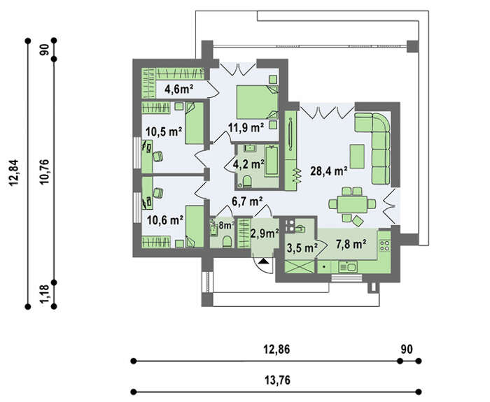Одноэтажный коттедж с плоской кровлею — это небольшой дом-праздник. На маленьком клочке поместилось все необходимое для комфорта и уюта.  Три спальни, гардероб и санитарные помещения. Главная гордость - большая, совмещенная в одно целое, комната для колдовства над пищей, вечерних посиделок и утреннего сбора у стола за завтраком.