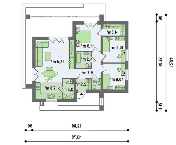 Одноэтажный коттедж с плоской кровлею — это небольшой дом-праздник. На маленьком клочке поместилось все необходимое для комфорта и уюта.  Три спальни, гардероб и санитарные помещения. Главная гордость - большая, совмещенная в одно целое, комната для колдовства над пищей, вечерних посиделок и утреннего сбора у стола за завтраком.