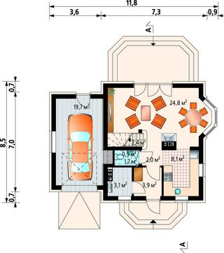 Часть первого этажа выделена под размещение автомобиля, что позволяет хозяину с комфортом выполнять его обслуживание. Остальная зона — царство для встречи друзей и родственников. Здесь достаточно места, чтобы смотреть захватывающие видео, любоваться живым огнем камина, в уютном эркере наслаждаться естественною красотою растений и принимать вкусную пищу. Специальный выход на загородный участок поможет перенести веселье на внешний простор, быстро организовать шашлыки и любоваться огромными розами, затейливо оплетающими беседки и арки.