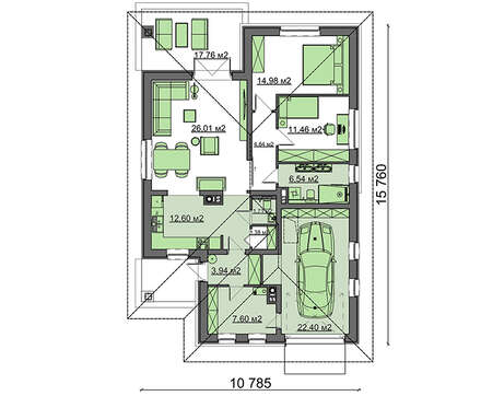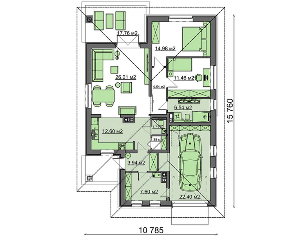 Проект содержит три раздела – АрхитектурныйКонструктивный и Инженерный: водоснабжение, отопление, вентиляция, канализация, электроснабжение (приобретается за дополнительную плату) + Пояснительная записка.
